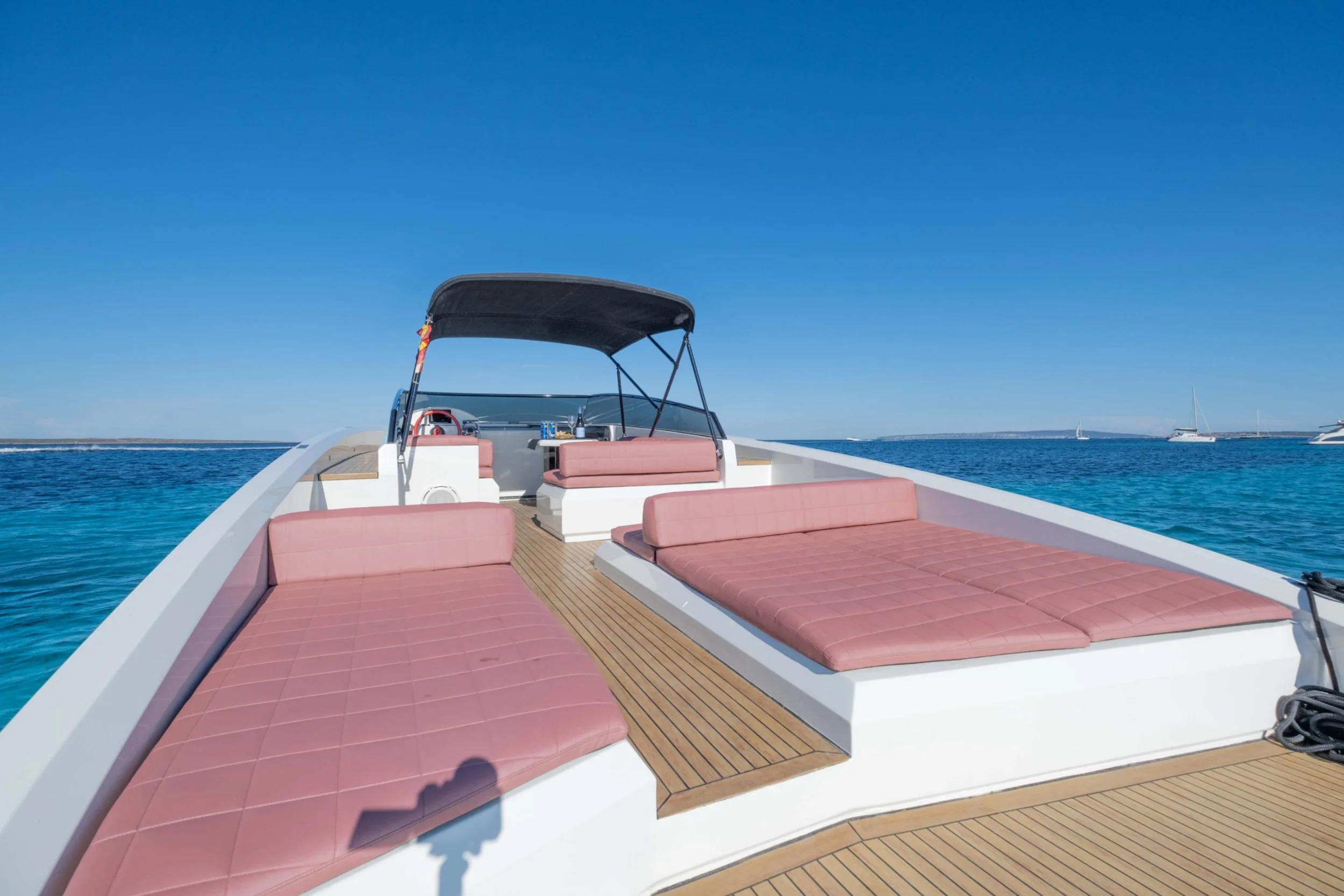 Step aboard our 43′ Vanquish yacht for a quintessential Ibiza experience. The 43’ Vanquish embodies the perfect blend of performance and comfort, featuring a sleek aluminum structure and agile design for a smooth, spray-free ride even at high speeds. Its lightweight build allows for reduced fuel consumption while enhancing speed on the water. The smart joystick steering system provides seamless maneuverability, while the spacious open deck comfortably accommodates up to 11 guests.