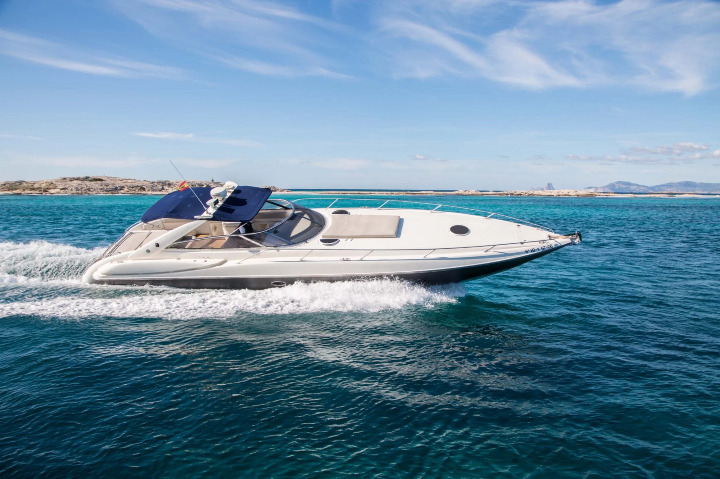 Step aboard our 48′ Sunseeker yacht, for an unforgettable Ibiza yacht experience. With room for 11 guests, this agile and sporty vessel blends dynamic style with luxury. Outside, the central lounge smoothly integrates with the aft bed, offering the perfect spot to relax and savor the sea breeze. This spacious outdoor area is ideal for admiring the scenic views and soaking up the sun.