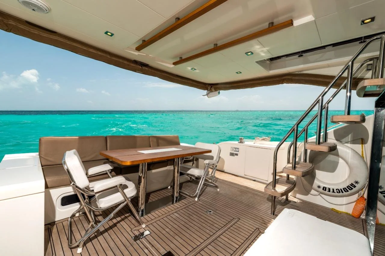 The Flybridge, our yacht’s crowning feature, provides a perfect vantage point to admire Cancun and Isla Mujeres, allowing guests to sip on their favorite drinks while soaking in the stunning views. The lower aft deck sets the stage for dancing and celebrating, enhanced by a top sound system.