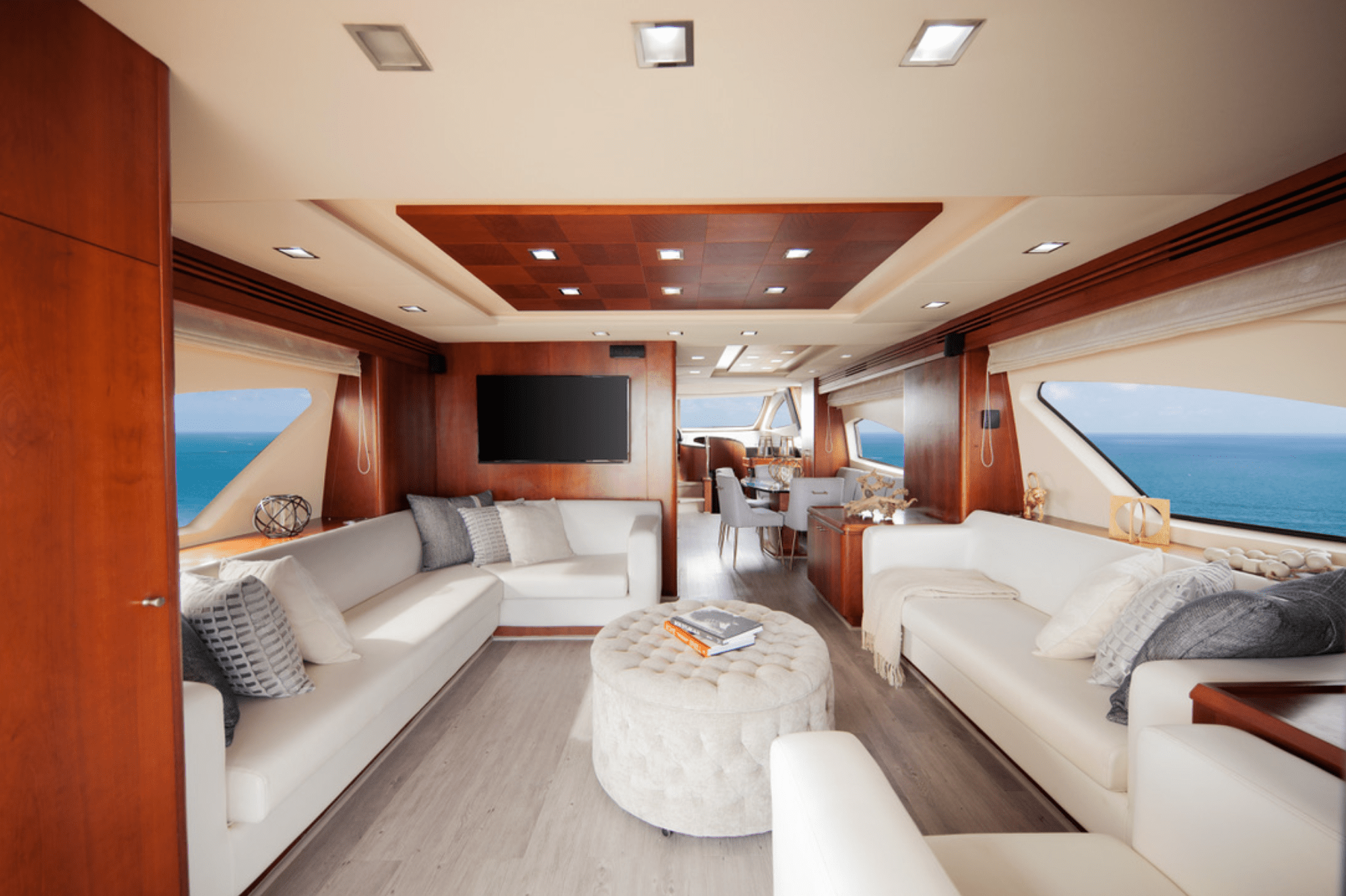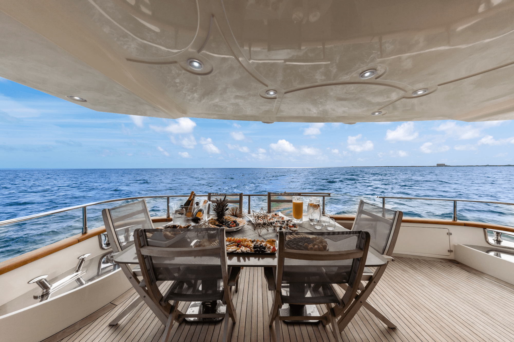 The expansive galley comes fully equipped, allowing your onboard chef to create exquisite dishes, enhancing your experience. With four lavish bedrooms, four bathrooms, a cozy living room, and a fully equipped kitchen, this yacht is designed to host memorable moments in sheer elegance.