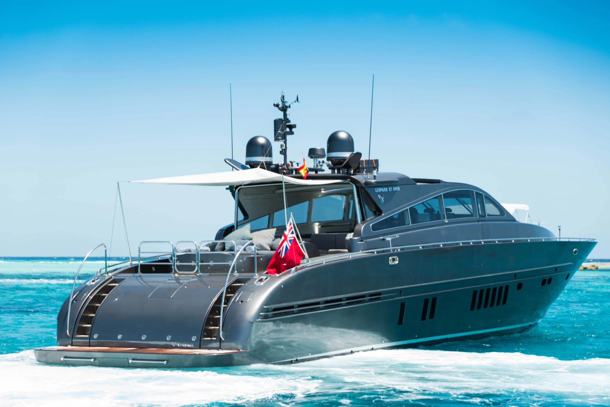 Join us aboard the 90-foot Leopard yacht for a premier yachting experience in the beautiful waters of Ibiza. Designed to accommodate 12 guests, this yacht features five luxurious cabins, each crafted to provide maximum comfort and serenity.